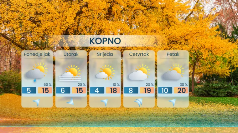 Početkom idućeg tjedna na kopnu slijedi više sunca, no ponedjeljak još neće biti potpuno stabilan – prema večeri je moguća prolazna naoblaka i poneki pljusak. Od utorka sunčanije i mirnije vrijeme, uz jutarnju maglu i svježinu, a od srijede će, uz novi dotok toplijeg zraka s juga, temperature ponovno rasti. Do petka se očekuje iznadprosječna dnevna toplina, i do 20 °C, uz uglavnom suho vrijeme.