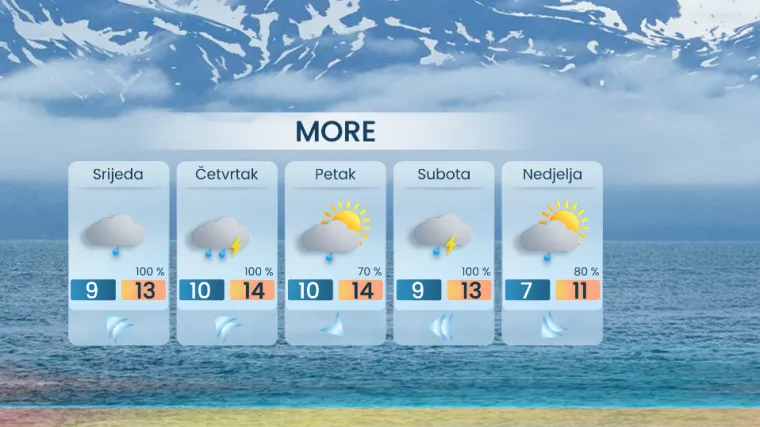 Na Jadranu će srijeda, a osobito četvrtak, donijeti kišu i snažan vjetar. Uz olujne udare juga, oštro more i nizak tlak, ponovno postoji opasnost od plavljenja riva. U petak se očekuje kratkotrajno smirivanje, dok će za vikend više oborina zahvatiti Dalmaciju, a na sjevernom dijelu obale zapuhat će jaka, mjestimice olujna bura. Do kraja tjedna bura će se proširiti cijelom obalom, donijeti razvedravanje, ali i osjetno zahladnjenje.