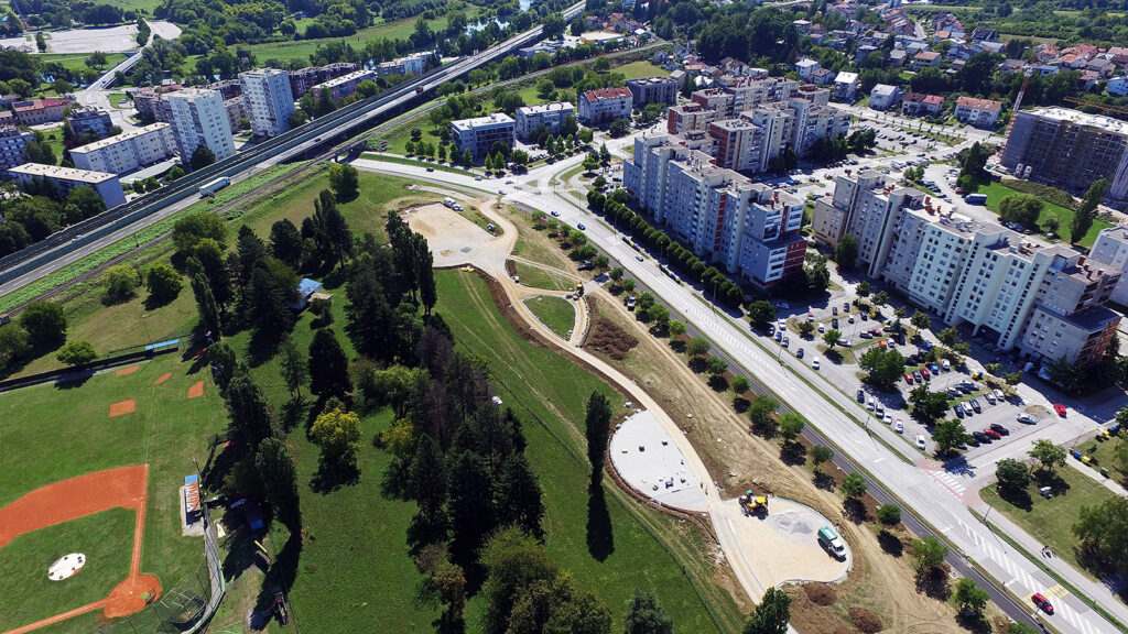 Umjesto zelenoj površini novi park je prednost dao “modernim sadržajima”, tu je ogromni plato veličine gradskog trga kod vrtića Grabrik, biciklistička infrastruktura te sportski tereni za košarku i nogomet.