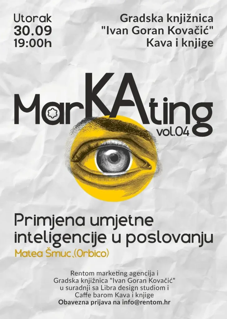 Ekonomistica Matea Šmuc iz Orbico grupe će u utorak s početkom u 19 sati u kafiću “Kava i knjige” koji se nalazi u glavnoj zgradi Gradske knjižnice “Ivan Goran Kovačić” u Karlovcu u sklopu programa “MarKAting” održati predavanje “Primjena umjetne inteligencije u poslovanju”.