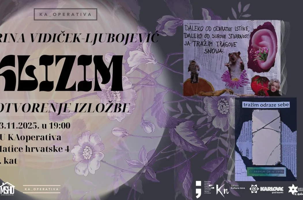 Savez udruga KAoperativa poziva na otvorenje izložbe “Klizim” mlade karlovačke umjetnice Irine Vidiček-Ljubojević. Izložba će biti otvorena u četvrtak 13. studenog u 19 sati u privremenim prostorijama KAoperative (Matice hrvatske 4, 3. kat).
