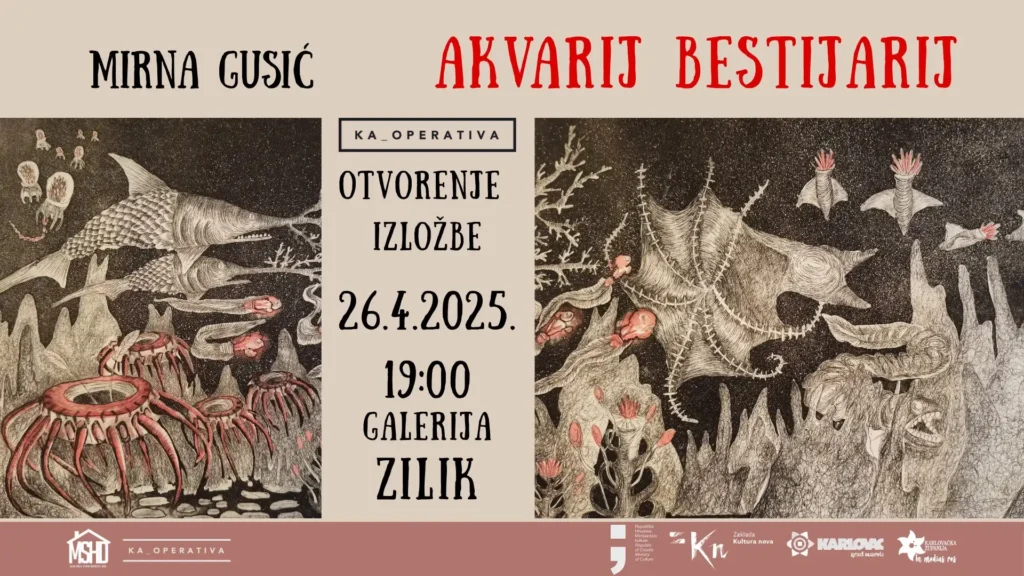 KAoperativa organizira izložbu grafika riječke umjetnice Mirne Gusić. Izložba pod nazivom Akvarij Bestiary bit će otvorena u karlovačkoj galeriji ZILIK 26. travnja od 19:00 sati. Razmišljajući o svijetu u kojemu živimo, zagađenosti kako kopna tako i mora, autorica dolazi na ideju stvaranja vlastitog postapokaliptičnog svijeta čiji bi protagonisti bili dubokomorski organizmi. Tako je autoričina inspiracija […]