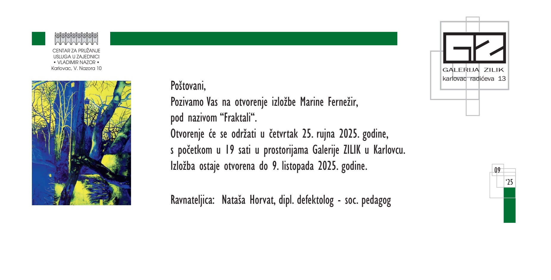 U Galeriji ZILIK u Radićevoj ulici u četvrtak 25. rujna u 19 sati bit će svečano otvorena izložba zagrebačke akademske slikarice Marine Ferenžir iz ciklusa slika "Fraktali". Izložba je organizirana od strane Centra za pružanje usluga u zajednici "Vladimir Nazor", a kustosica je povjesničarka umjetnosti, viša kustosica Sonja Švec Španjol. Svi zainteresirani moći će je […]