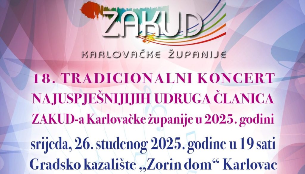 U Gradskom kazalištu Zorin dom ove srijede (26. studenog) održava se tradicionalni koncert najuspješnijih udruga članica ZAKUD-a Karlovačke županije. Ulaz je besplatan, a publika će moći uživati u nastupima dječje sekcije FA Ivan Mažuranić (u suradnji s OŠ Turanj i KUD Turanj), dječjeg ansambla KUD-a Klek Ogulin, skupine Fijolica KUD-a Sveti Juraj Draganić, KUD-ova Sveta […]