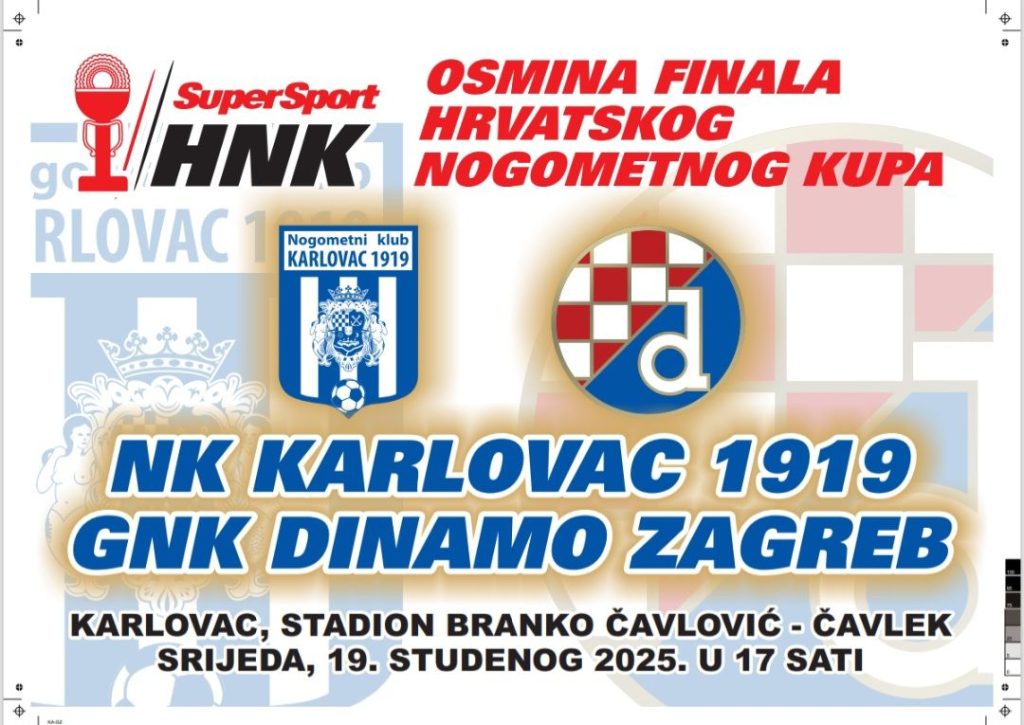U srijedu, 19. studenog, nogometaši Karlovca 1919 u osmini finala Hrvatskog nogometnog kupa dočekuju najtrofejniju hrvatsku momčad - zagrebački Dinamo. Utakmica se igra u 17 sati na Stadionu Branka Čavlovića Čavleka, a karte se već nalaze u pretprodaji u caffe baru Korner pored stadiona.