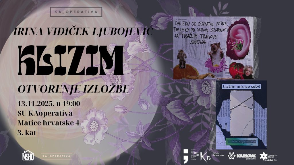 Savez udruga KAoperativa poziva na otvorenje izložbe "Klizim" mlade karlovačke umjetnice Irine Vidiček-Ljubojević. Izložba će biti otvorena u četvrtak 13. studenog u 19 sati u privremenim prostorijama KAoperative (Matice hrvatske 4, 3. kat). Napuštanje prošlosti ne mora biti dramatično, ne mora biti grubo. Klizim kroz život, klizim do sutra… Zadnjim prikazom onog jučer napuštam što […]