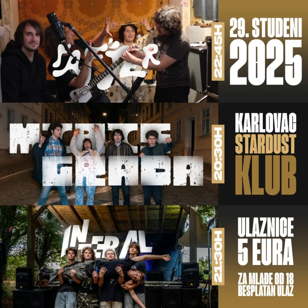 Ove subote u Stardustu sve je u znaku karlovačkih bendova. Publici će se predstaviti bendovi Fafter, Miris Grada i Interval, sve počinje u 20:30 i potrajat će do ponoći. Cijena ulaznice je 5 eura, a za mlađe od 18 godina ulaz je - besplatan.