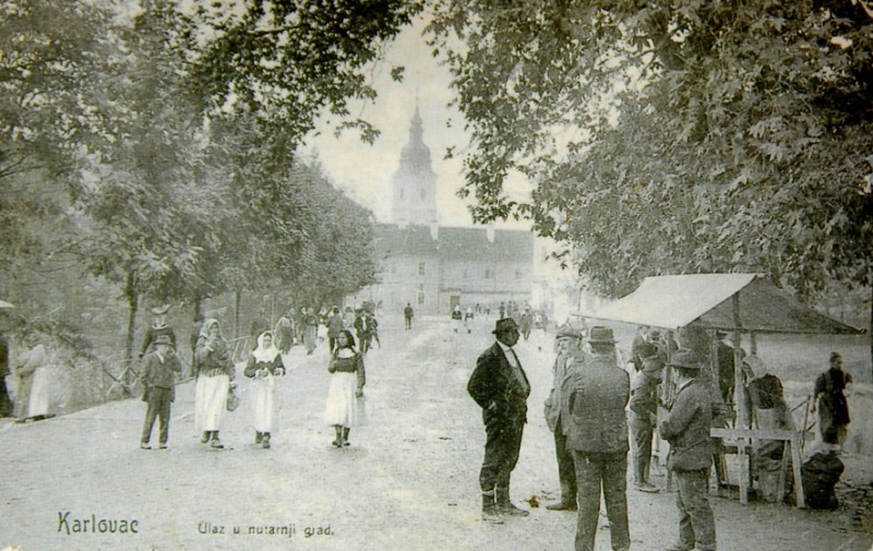 Na ulazu smo Strossmayerova trga, ili kako piše na razglednici “ulaz u unutarnji grad”, odnosno povijesnu karlovačku Zvijezdu. Šanac je već bio premošćen nasipom. Ovdje je do 1884. godine bila zgrada “glavne gradske straže” u starije doba Banska vrata i glavni ulaz u tvrđavu. Gradski magistrat dao je srušiti ta vrata i most spomenute 1884.godine. Evo što pišu karlovačke novine “Svjetlo” (broj 52, 1884). “Pred dvie ili više godina, kada se je razmišljalo o demoliranju mostova i raznih tvrdjavskih vrata, zamolilo je bilo slav. gradsko poglavarstvo i zastupstvo visoki erar (vlast, država, op.a.) da bi im dozvolili na vlastiti trošak poništiti stara gradska vrata i most, ujedno pak i nasip, koji se baš i nalazi oko današnje kadetske škole, odstraniti i onu jamu, zasipati i kanalizirati… Kraj kadetske škole nalazi se bašća, nu osim toga posađeno je i na istom nasipu raznog drveća”. Krajem 19. i početkom 20. stoljeća tu je počinjao karlovački sajam – jednim se krakom pružao na oba trga u Zvijezdi, a drugim prema Preradovićevoj ulici, duž Trga Matije Gupca, pa Domobranskom – sve do Gimnazije. Ova je razglednica putovala 1914. godine, a nakladnik nije poznat.