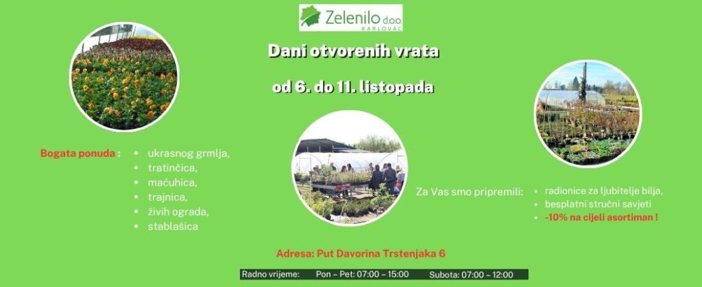 Tako i ove godine, od 6. do 11. listopada 2025., otvaramo vrata našeg zelenog carstva svim Karlovčanima, zaljubljenicima u prirodu, cvijeće i drveće, ali i gostima iz šire Karlovačke županije te susjednih zemalja. Manifestacija već tradicionalno okuplja brojne ljubitelje cvjetnih raskoši, a posjetiteljima omogućuje da, uz posebne popuste, u svoj dom ponesu djelić prirodne ljepote – biljke kakve krase naše karlovačke parkove, perivoje i cvjetnjake.