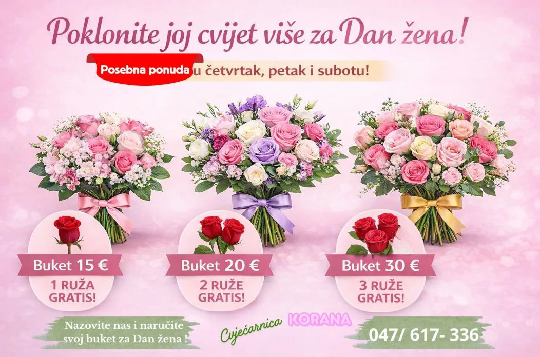 Ne čekajte posljednji trenutak, nazovite nas i naručite svoj buket za Dan žena na broj 047/617-336. Razveselite je gestom koja govori više od tisuću riječi.