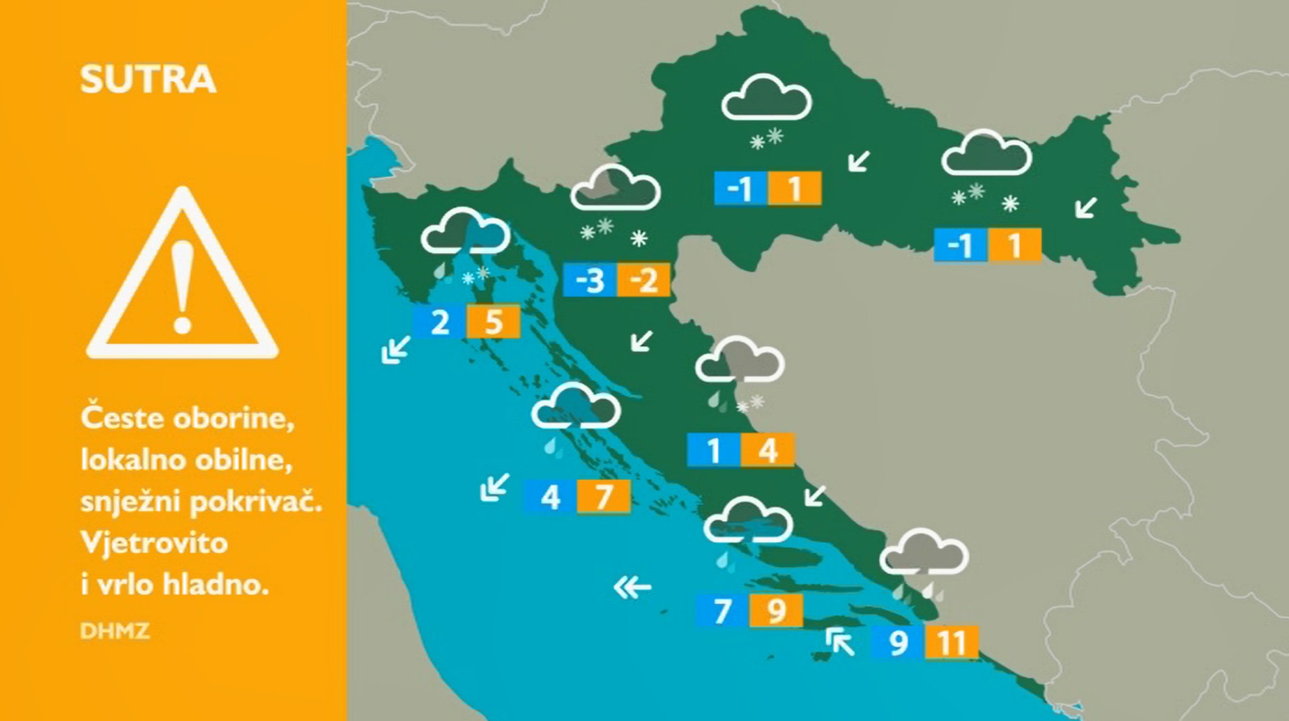 Sutra će biti umjereno do pretežno oblačno. Na kopnu će povremeno padati snijeg, jače i češće poslijepodne i navečer, iako ga malo može biti i već prijepodne. Mjestimice će se stvarati, a u Lici i Gorskom kotaru podebljavati snježni pokrivač.