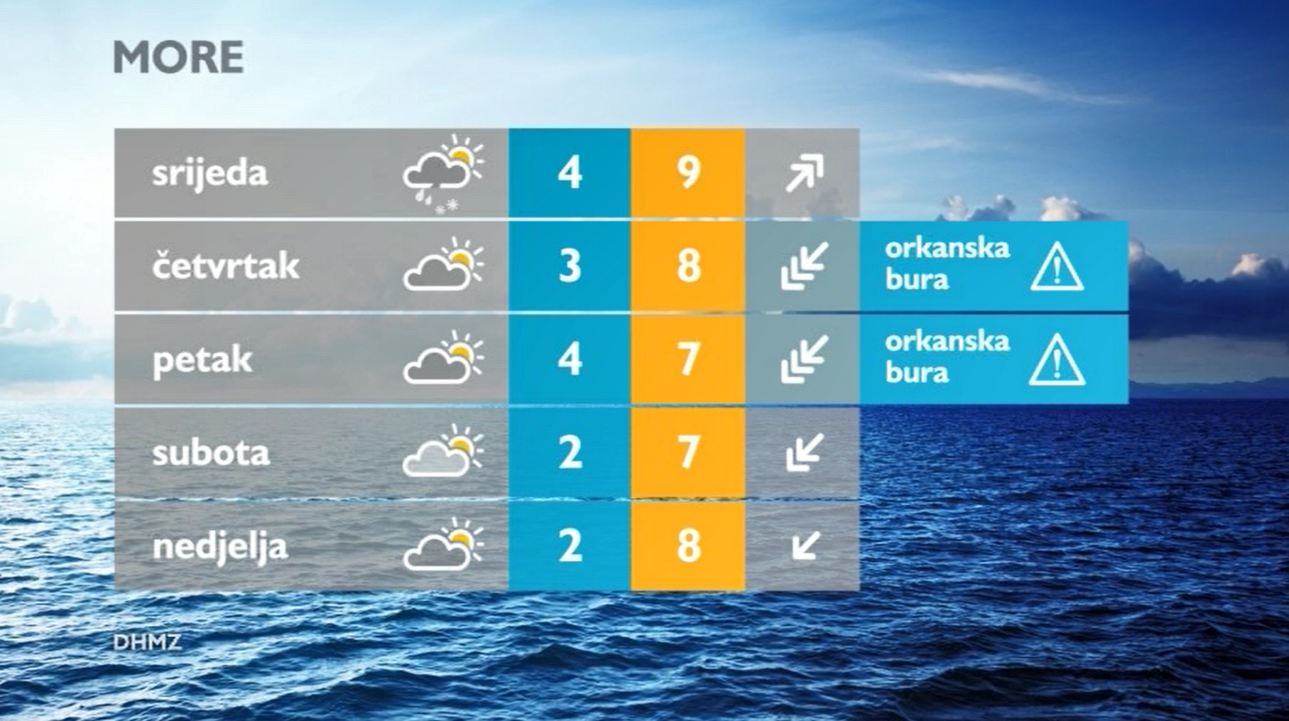 Do kraja današnjeg dana bit će oblačno, u Dalmaciji uz još kiše, na kopnu sve češći snijeg, osobito između Siska i Nove Gradiške gdje je moguće i stvaranje tanjeg pokrivača od nekoliko centimetara. Bura već puše jako, a u idućim satima nastavlja jačati.