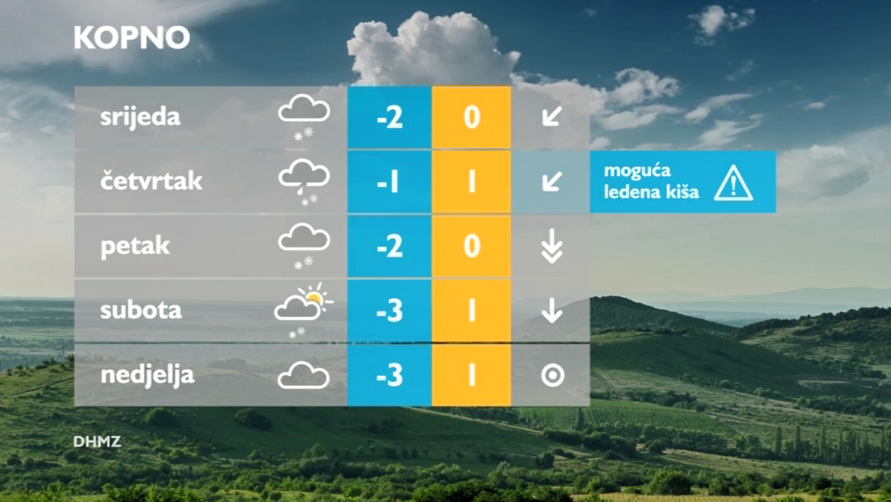 Od srijede do kraja tjedna na kopnu će biti pretežno oblačno, povremeno će padati snijeg, najčešće i najjače u Gorskom kotaru i Lici, no bit će ga i u nizinama, i to više nego u dosadašnjem dijelu zime koja je snijegom bila vrlo skromna. Tako će se stvarati i pokrivač koji u dijelovima Slavonije, ponajprije duž Posavine te u Srijemu može biti i deblji – do kraja tjedna moguće je više od 20 centimetara. U središnjoj Hrvatskoj između 5 i 20 cm, s time da će više snijega biti na jugu, oko Karlovca i Siska, a manje na sjeveru, oko Varaždina, Koprivnice i Bjelovara.