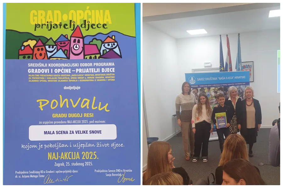 Tom su prigodom dodijeljene Pohvale i Povelje gradovima i općinama za najuspješnije Naj-akcije provedene tijekom 2025. godine, a Duga Resa je i ove godine među nagrađenima. Gradu je uručena Pohvalnica za Naj-akciju 2025. za projekt “Mala scena za velike snove”, proveden tijekom pedagoške i školske godine 2024./2025.